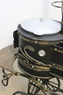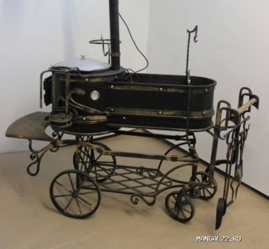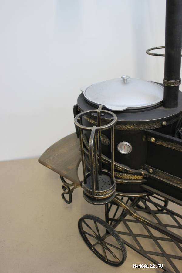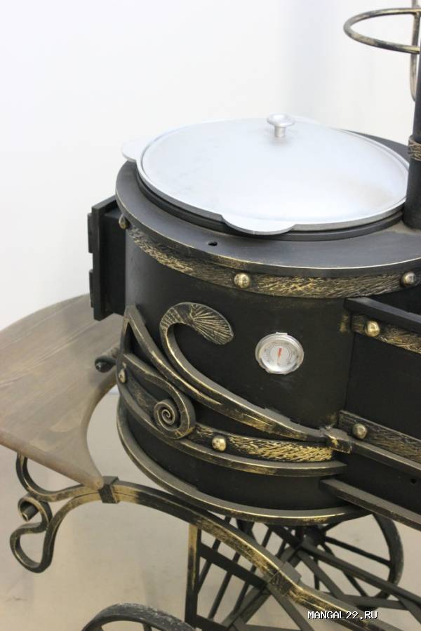 Новую модель "Мангал-Казан средний" мы дополнительно оснастили поворотной осью и изменили диаметр колес, что позволит Вам с еще большей легкостью транспортировать его по участку. Увеличили диаметр топки для казана, а топочную трубу установили на верхней части. Установили поворотный