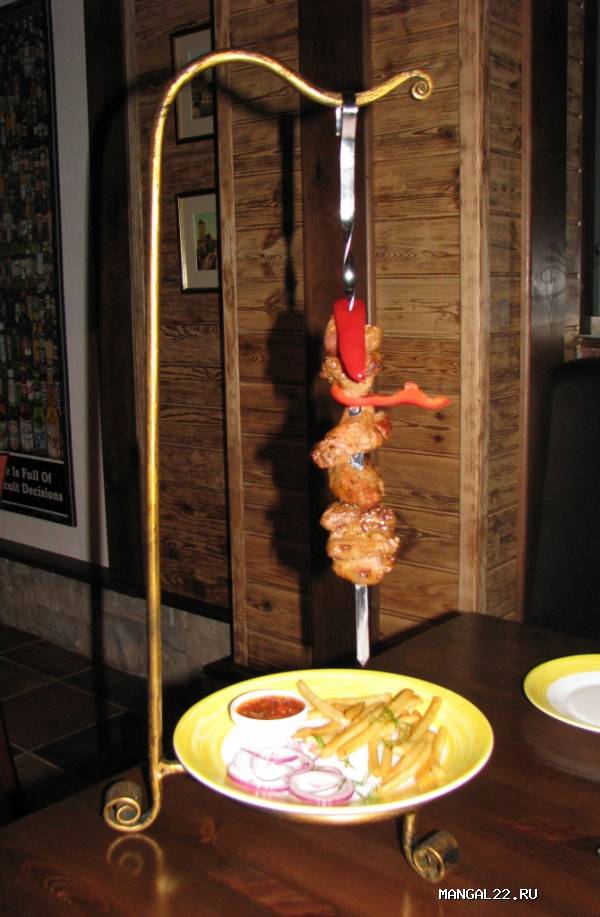 В С нашей стойкой для подвеса шашлыка вы сможете удивить своих гостей не только вкусным шашлыком, но и изяществом подачи блюда. Стойка изготовлена из металлического прута, сечением 8 мм., с элементами горячей ковки металла. Лакокрасочное покрытие с нанесением золотой или медной патины.В