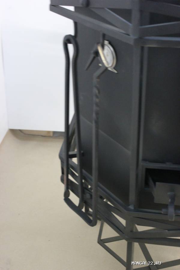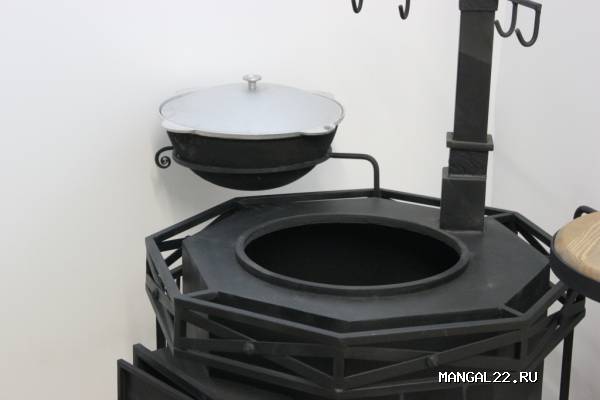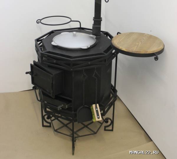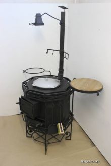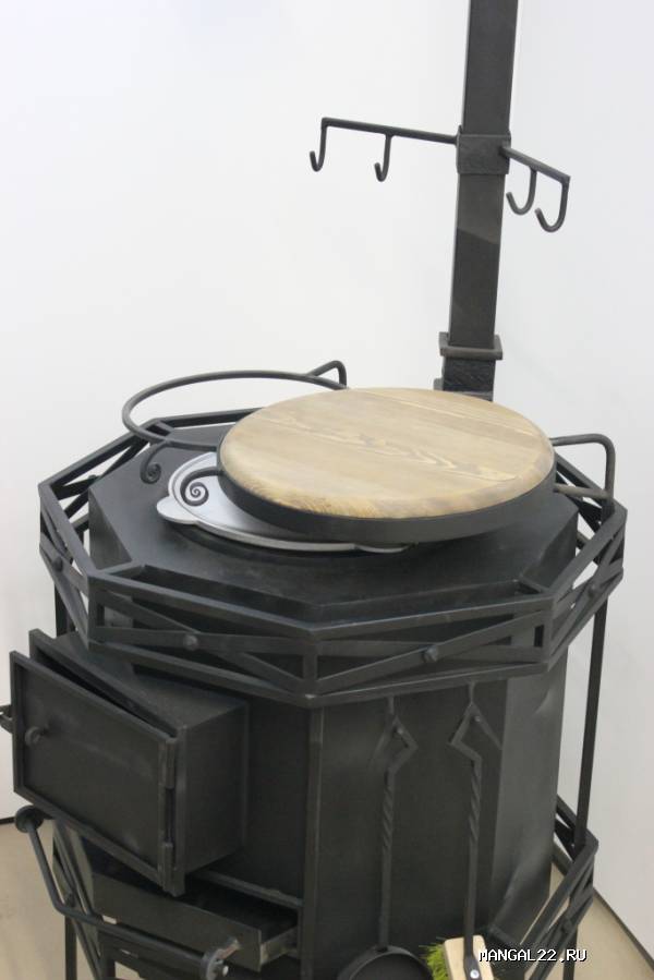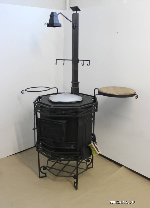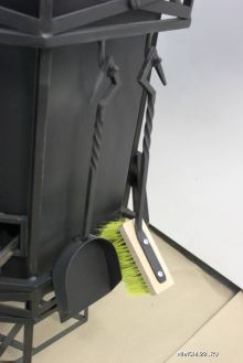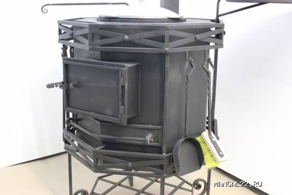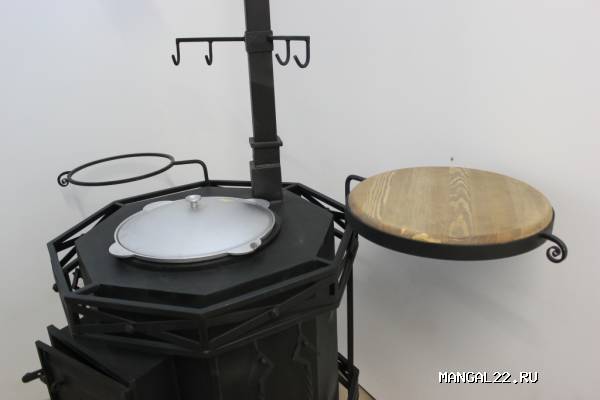 Поставляется в комплекте с набором из 4-х инструментов (щетка, совок, щипцы для углей, кочерга), казаном, оснащена поворотным светильником, подставкой для казана и полкой так же с поворотным механизмом. Для подвешивания рабочего инструмента (поварешки, вилки...) приспособлены 4 крючка на топочной трубе. В корпус топки встроен термометр. Нижняя часть топки используется как дровянник. Так же существует возможность приготовления на решетке.