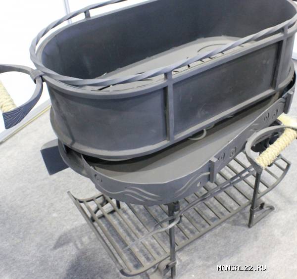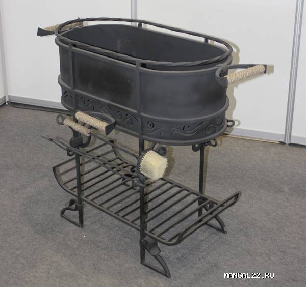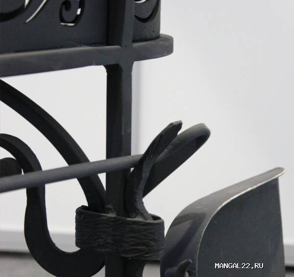 Классический мангал для приготовления шашлыка и жарки на решетке. Оснащен большим, выдвижным зольником и набором из четырех инструментов (щипцы для угля, щетка, кочерга, совок), удобно расположенных на подвесах по бокам мангала. В нижней части находится ниша для дров.